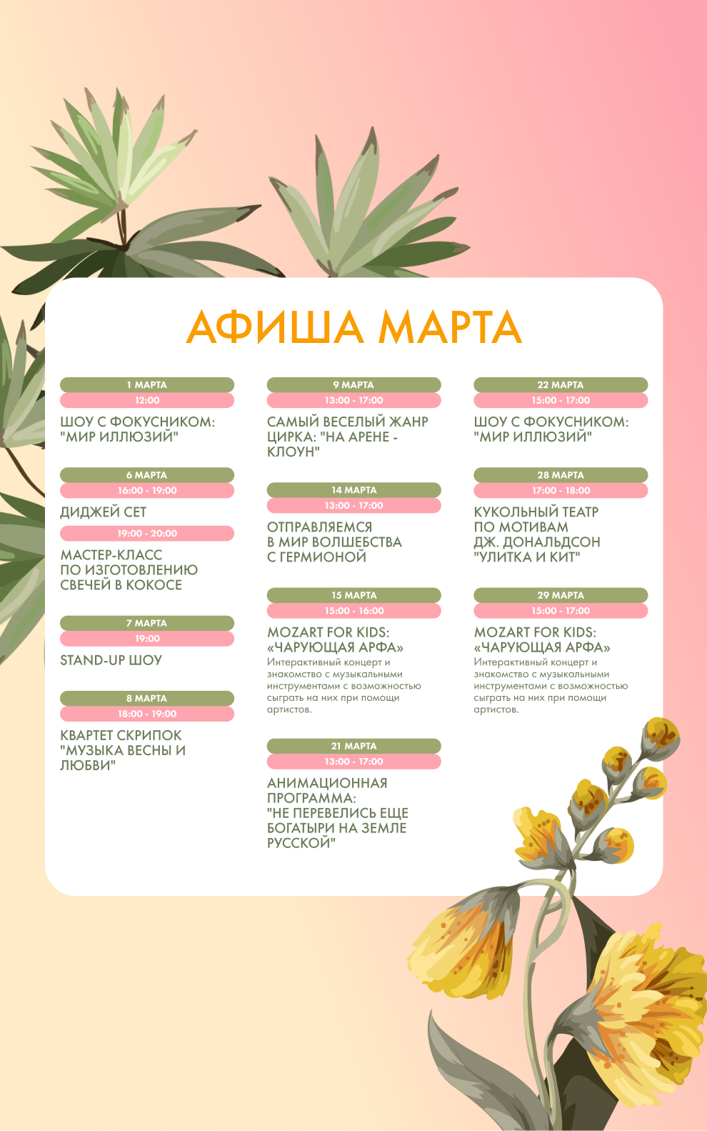 Выбирайте формат по настроению: от мастер‑классов и детских анимаций до Stand-Up шоу и DJ вечеров.
